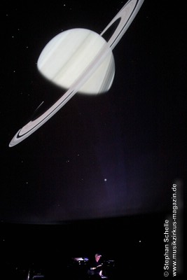 Im Stück „Mandarinentraum“ kamen natürlich einige Klänge und Melodiefolgen sowie Sequenzerparts zum Tragen, die man von Tangerine Dream her kennt, auf die bei diesem Titel angespielt werden soll. Auch das Stück „Outro“, das die Eigenkompositionen in seinem Set beschloss, stammt von „The Journey To Another Place“. Untermalt wurden Frank‘s Stücke durch große Animationen des Saturn, eines eisigen Meteoriten, der langsam über den Köpfen der Besucher dahinzog und durch Satelliten, die teilweise unseren Heimatplaneten umkreisten. Das sah majestätisch aus und passte perfekt zu seiner Musik.