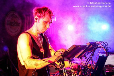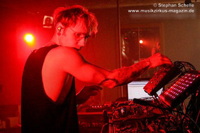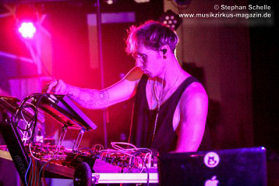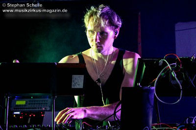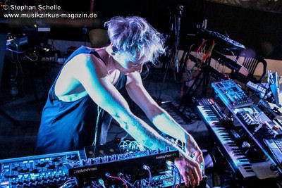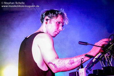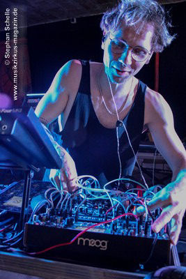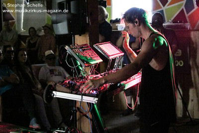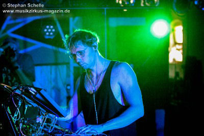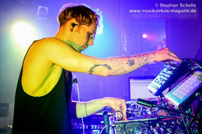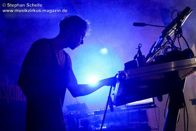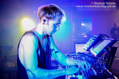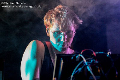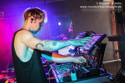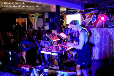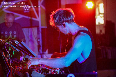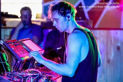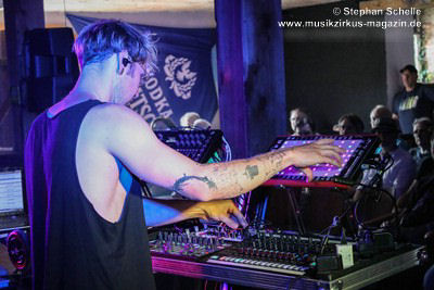 Er begann sein Set mit mysteriösen Klanggebilden und leichten Rhythmusmustern. Nach gut viereinhalb Minuten startete er dann einen pumpenden Beat und spielte dazu einige Harmonien. Er nutzte dazu kein Keyboard, sondern arbeitete an Drehreglern, Schaltern, Loopstation und Grafikpads. Dabei spielte er sich auch in einen Flow, der ihn aus dem Hier und Jetzt beamte und gab sich so ganz der Musik hin. Er wechselte beispielsweise Rhythmen, in dem er mit dem Finger auf ein Eingabegerät tippte und so rhythmische Elemente erzeugte, die geloopt und übereinandergeschichtet wurden. Das klang dann zwischendurch auch mal disharmonisch, was aber durchaus gewollt war. Es war unglaublich, wie er den Überblick über die Sounds und Rhythmen behielt und das Ganze auch noch so leicht und spielerisch aussehen ließ. Das zeigte, dass er bei dem Konzert ganz mit seiner Musik verschmolz.