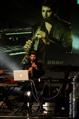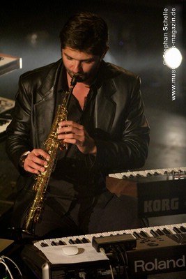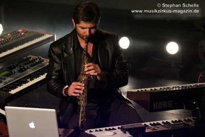Winfried Wiesrecker filmte Fryderyk Jona bei seinem Auftritt. Diese Aufnahmen wurden dann live auf die hintere Leinwand projiziert, so dass man sehr schön im Publikum sehen konnte, welchen Anteil die live gespielten Passagen von Fryderyk hatten. Es war beeindruckend zu sehen, wie traumwandlerisch sicher er das Instrumentarium bediente. Mit seinem Sopran-Saxophon sorgte er darüber hinaus für unter die Haut gehende Momente.