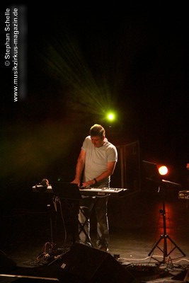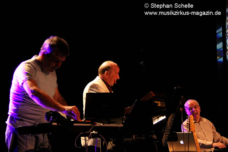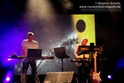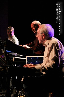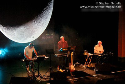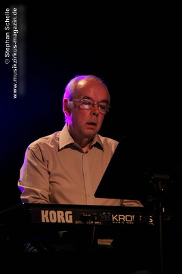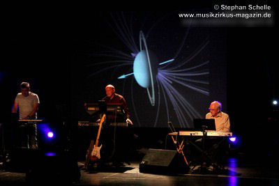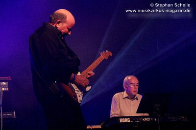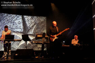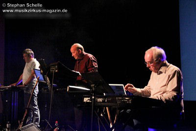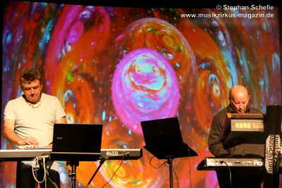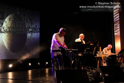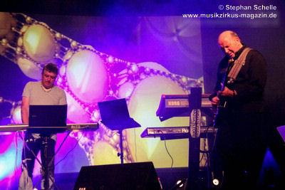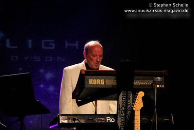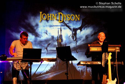 Dann legte erneut John Dyson zusammen mit seinen Mitstreitern los. Für das Stück „Moonwind“ vom gleichnamigen Album kam er an den Bühnenrand und griff zu seiner E-Gitarre. Aus ihr holte er sehr schöne atmosphärische Klänge, und reicherte die elektronischen Soundgemälde seiner beiden Kollegen mit wunderbaren Gitarrenklängen an. Damit verlieh er dem Stück einen leichten Hauch von Progressiver Musik zumal auch ein ums andere Mal eine sanfte Prise David Gilmour hervorkam.
