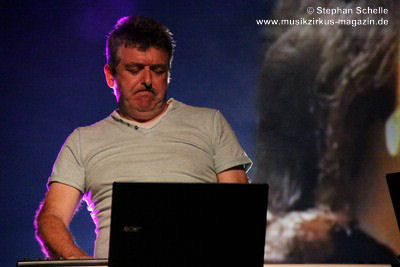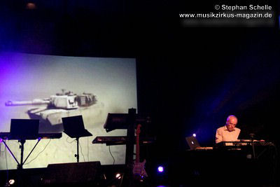 Dem schloss sich dann nahtlos das Stück „Into The Battle“ von Michael Shipway, der auch zu den Elektronikprojekten VoLt und Lamp gehört, an. Auch dieses Stück, das von seinem zweiten Soloalbum „Into Battle“ aus dem Jahr 1994 stammt, ist von rhythmischen Elementen beseelt. Darauf legte er eine eingängige Melodie. Man konnte deutlich erkennen dass die drei Musiker stilistisch nicht weit auseinander liegen und ihre Tracks und Spielweise perfekt zusammen passen. Leider hatte Michael, dessen Stück auf Schlachten der frühen Weltgeschichte beruht, dieses mit Bilden von computeranimierten Panzerschlachten in einer Wüstenlandschaft bildhaft unterlegt. Für meinen Geschmack war das für die heutige angespannte Lage in der Welt nicht wirklich geeignet, konnte die Faszination dieses wunderbaren Stückes aber nicht schmälern.
