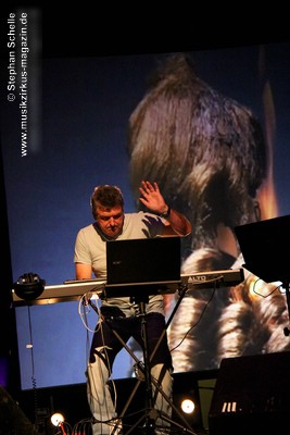 Als nächstes standen die Solostücke der beiden weiteren Protagonisten an, die jeweils dazu allein auf der Bühne agierten. Paul Ward startete in diesen Teil mit seinem Solostück „The Last Toy Emily Broke“ das mit Flächen begann, die sehr stark an Genesis Beginn von „Watcher Of The Skies“ erinnerten. Nach gut zwei Minuten erklang dann eine Spieluhr und der Sound und die Melodie änderten sich schlagartig. Zu den etwas verstörenden Bildern einer brennenden Puppe präsentierte sich Paul äußerst rhythmisch, so wie man es von seinen beiden Soloalben aus den 90’ern „For A Knave“ und „The Fear Of Make-Believe“ her kennt. Dem spendierte er aber noch einen harten Rhythmus, der das Stück in Richtung Industrial leitete. Es ist zu hoffen, dass Paul (er hat nach den beiden Alben für zahlreiche Musiker geschrieben) in naher Zukunft wieder ein Album herausbringt.