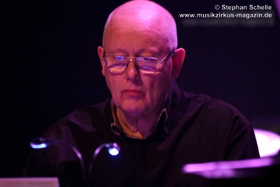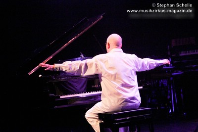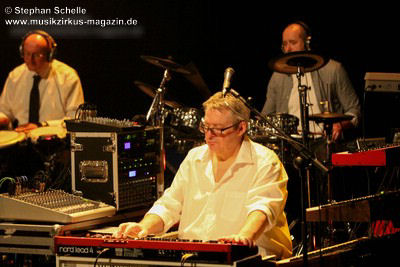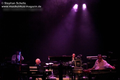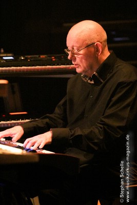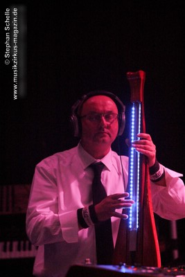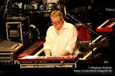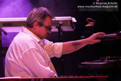 Daran schloss sich mit „Aurora Choralis“ ein Stück an, bei dem sich die anderen Musiker zurücknahmen und John Kerr die Bühne überließen. Dieses hymnisch, klassisch, sakrale Stück ließ die Zuschauer für einen Moment inne halten und tief in den Musikkosmos von John Kerr eintauchen. Zu Beginn von „Oceans Of Commotions“ wechselte John dann zunächst wieder an den Flügel, um das Stück effektvoll einzuleiten. Er spielte die Melodie zunächst Solo an diesem Instrument und zeigte hier seine musikalische Klasse. Nach gut zwei Minuten führten dann die bekannten Wellengeräusche und Keyboardsounds in den Kern des Stückes über, während John wieder hinter seinem Keyboard Platz nahm. Der Track entwickelte sich durch Schlagzeug und E-Gitarre dann zu einem rockigen Stück, bei dem John an den Keyboards ein wenig unterging, was bei mir gemischte Gefühle auslöste. Zum Einen mag ich die rockige Variante der Elektronikmusik, zum Anderen hätte ich beim vielleicht letzten Auftritt von John Kerr gerne mehr von seinem Spiel gehört.