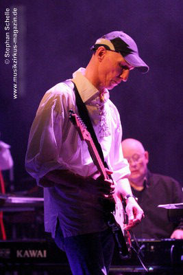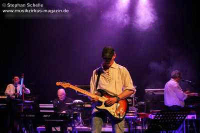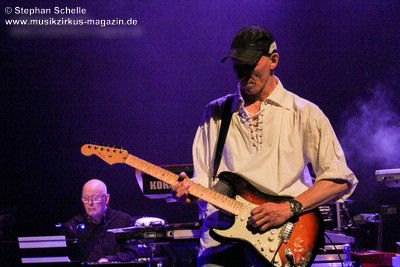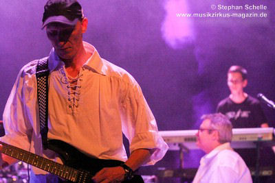 Zum zweiten Part von „Juxtaposition“ kam dann Gitarrist Frank Dorittke aus dem Hintergrund, sein Instrument spielend, langsam auf die Bühne. Zunächst streute er noch einige sehr atmosphärische, proggige Riffs mit ein. Das passte hier ganz gut zu dem Stück. Allerdings war seine Gitarre schon recht dominant in den Sound gemischt, so dass in den rockigen Passagen diese zu sehr im Vordergrund stand und der Track schon in Richtung MorPheuSz zielte. Und auch Jeffrey  Haster war nun an den Keyboards zu sehen und zu hören.