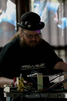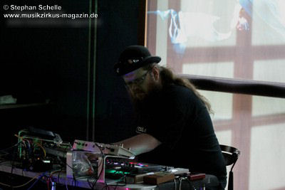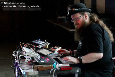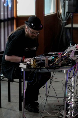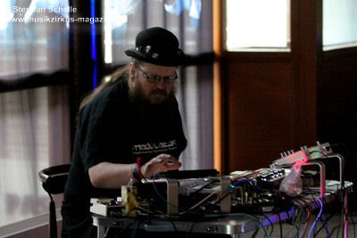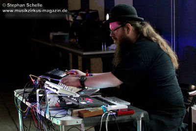 Im oberen Saal spielte zu Beginn und zwischen den Konzerten Jez Creek, der auch als Modulator ESP firmiert. ESP steht dabei für „Experimental Synthesis Project“. Der aus dem britischen Nottingham stammende Musiker spielte dort seine Sets Solo. Hier einige Fotos: