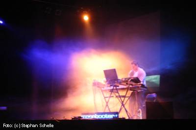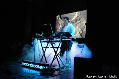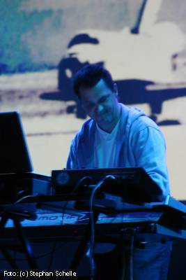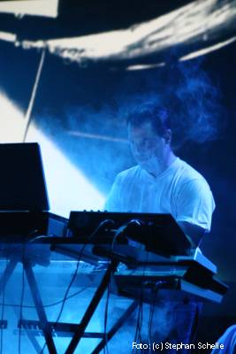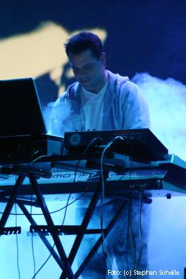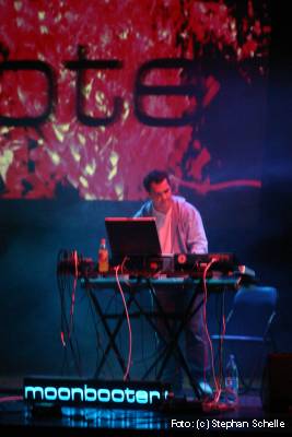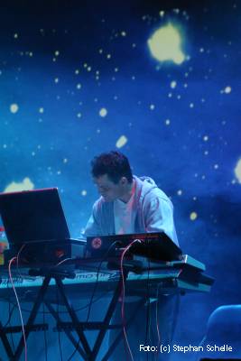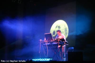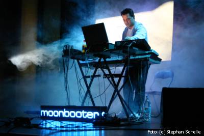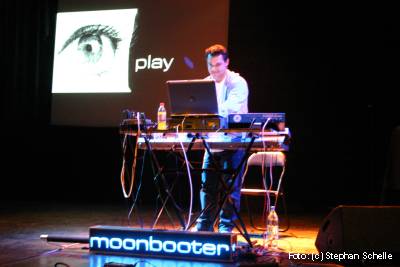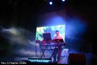 neuen Stücken. Als Gimmick hatte Bernd vor seinen Keyboards einen „Moonbooter“-Neonschriftzug