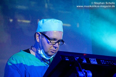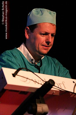 Andreas, die in ihrem OP-Outfit um eine Keyboardtastatur standen und