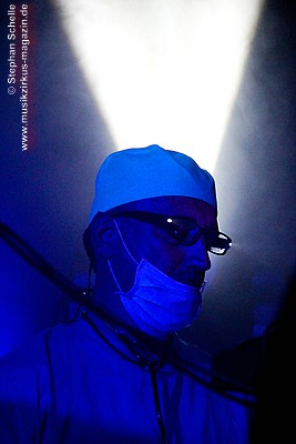 zeigt die drei Musiker in OP-Bekleidung. Dieses Outfit hatten sie sich