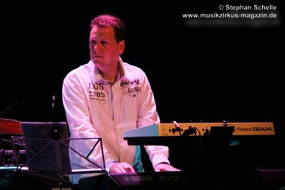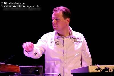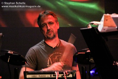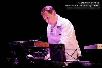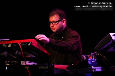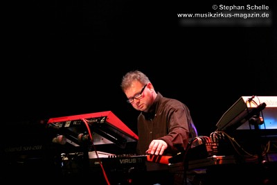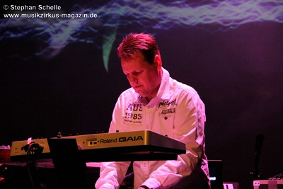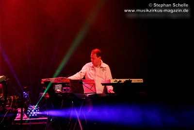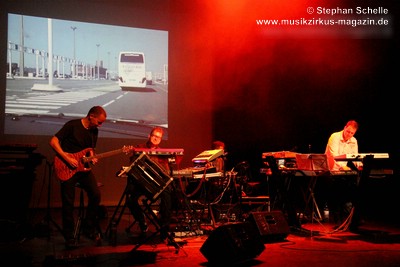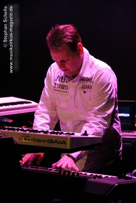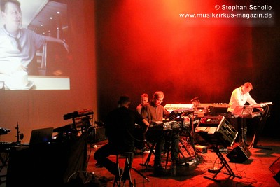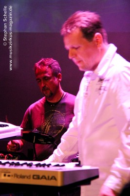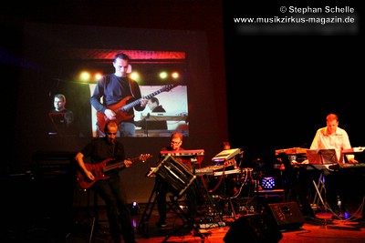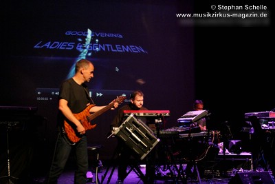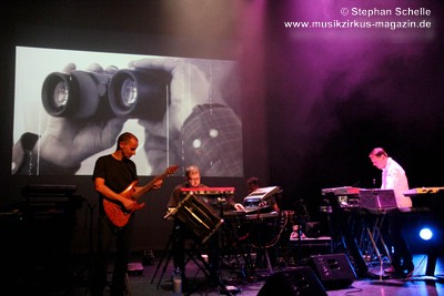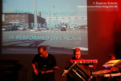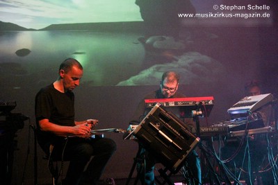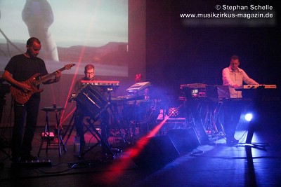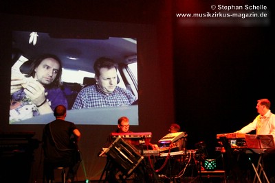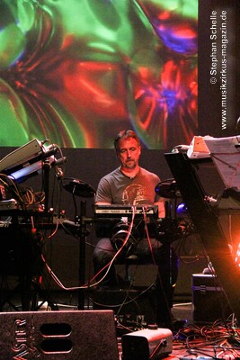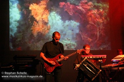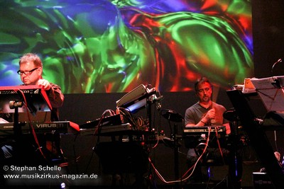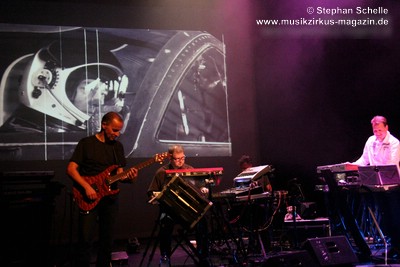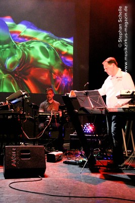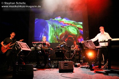 Und wieder ging es atmosphärisch und spacig weiter. Dieses mal mit dem neuen Stück „Stratosphere“. Dazu wurde ein Film von Testpiloten gezeigt, der schon etwas antiquiert zu sein schien bzw. auf alt getrimmt war. Schwebende Flächen trafen in diesem Stück auf pulsierende Sequenzer und leicht rockig angehauchte Gitarrenmotive. Dem folgte dann mit „Injection“ wieder ein Stück der aktuellen Pyramid Peak-CD „Anatomy“. Sehr schöne Farbspiele bestimmten auf der Leinwand und der Bühne das optische Bild.