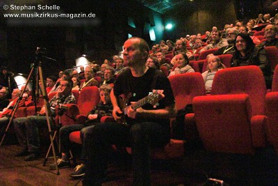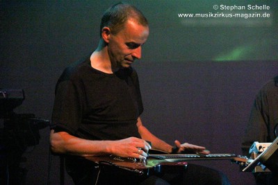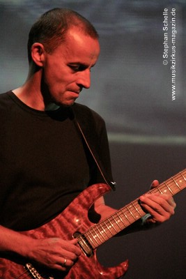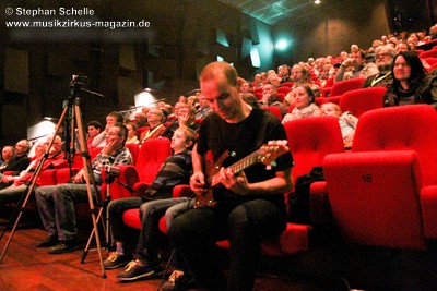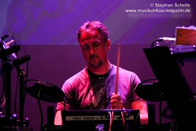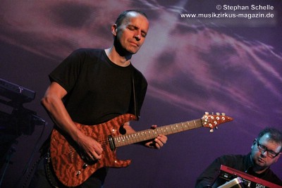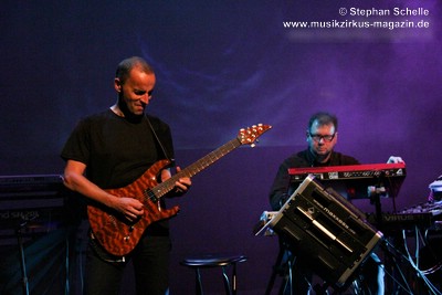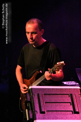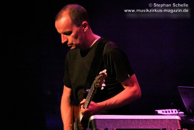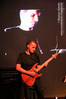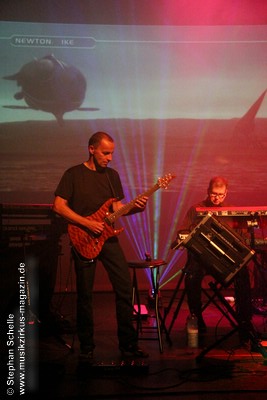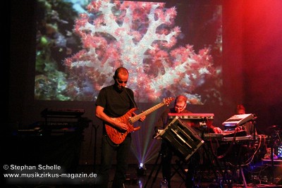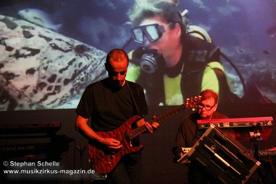 Mit „Dive“ vom Album „Ocean Drive“ hatten sie dann einen Klassiker (für mich eines der schönsten Stücke von Pyramid Peak) im Programm, der erstmals mit Gitarre live gespielt wurde. Der eingängige und mitreißende Track gewann durch Max‘ Gitarre um Einiges. Max ging dabei aber – wie beim gesamten Konzert – recht behutsam mit seinem Instrument um. Auch der Rhythmus, eine Kombination aus dem Rechner und dem Schlagzeugspiel von Uwe Denzer war knackiger als im Original gespielt. Dieses Mal waren im Hintergrund wunderbare Unterwasseraufnahmen zu sehen.