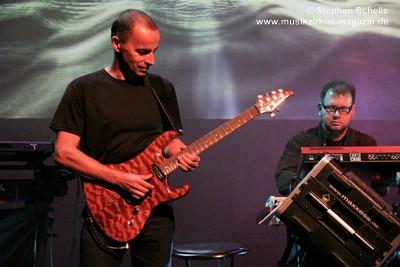 Als zweiten Track hatten sie mit „Dark Energy“ ein Stück vom aktuellen Album „Anatomy“ im Programm. Auch dieses Stück begann recht sphärisch während Maxxess einige sehr proggige Gitarrenmotive in die Musik einbrachte. Seine Gitarre tat den Stücken sichtlich gut. Wie Ron es vor dem Konzert schon bemerkte, ist Max‘ Gitarre die „Kirsche auf der Torte“ oder wie wir sagen würden, „Das Salz in der Suppe“ bei den Stücken von Pyramid Peak. Als optische Untermalung hatten sie ein Video mit Computeranimationen einer fremden Welt an die Leinwand projiziert, das die Musik perfekt unterstützte.