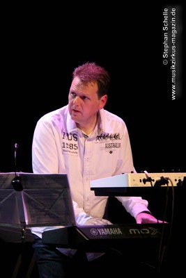 Die Jungs begannen mit einem ganz neuen Stück, das so neu ist, das es noch keinen Namen trägt. Die vier, das sind Axel „Axess“ Stupplich, Uwe Denzer und Andreas Morsch sowie Max „Maxxess“ Schiefele, starteten mit dem Opener recht sphärisch in ihren Gig. Auch Max, der ansonsten für eine recht rockige Gitarre gut ist, steuerte eher sphärische Gitarrenklänge bei, die im weiteren Verlauf dann aber recht moderate rockige Ausmaße annahmen. Die Keyboardsounds schwebten so ein bisschen durch den Raum und erinnerten damit auch ein wenig an die „Berliner Schule“. Doch schnell schälte sich eine Rhythmussequenz heraus, die deutlich die Handschrift von Pyramid Peak trug. Mit fortlaufender Dauer nahm das Stück an Dynamik zu und Maxxess durfte dann zum Ende hin doch noch mal ein wenig das Tempo anziehen, in dem er ein sehr schönes Solo einbaute. Ein klasse Einstieg in den Gig.