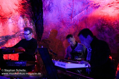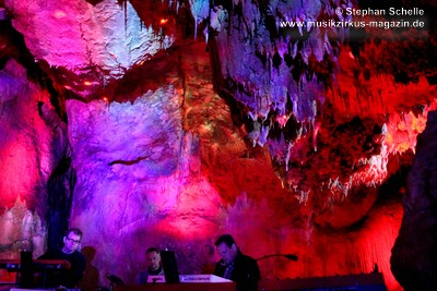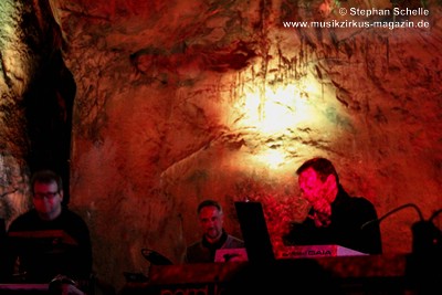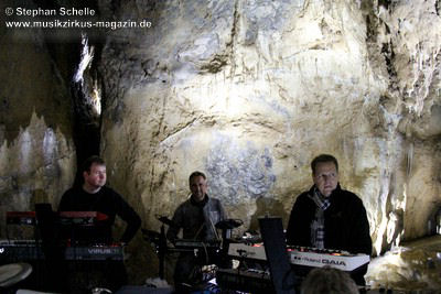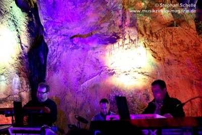 Bei den beiden neuen Stücken, die speziell für die Höhle komponiert wurden, haben Pyramid Peak wieder versucht die Soundauswahl und die Arrangements so zu gestalten, dass sie zur Atmosphäre in der Höhle passen. Das ist ihnen auch wieder hervorragend gelungen. Axel meinte dazu: „Ehrlich gesagt hatten wir beim Erstellen der Stücke manches Mal eine Gänsehaut wenn wir uns vorgestellt haben wie eine bestimmte Sequenz oder Fläche in der Höhle wirken würde.“ Sphärisch und mystisch war der Beginn des Konzertes. Die Drei ließen zunächst einige Klänge durch die Grotte schweben, die auch gut als Soundtrack zu einem Thriller, in dem langsam die Spannung aufgebaut werden soll, hätte herhalten können.