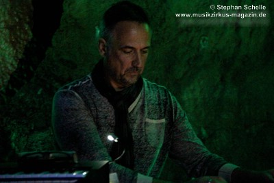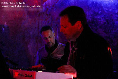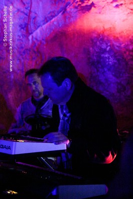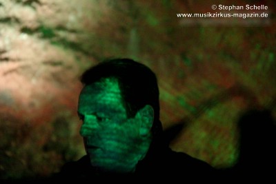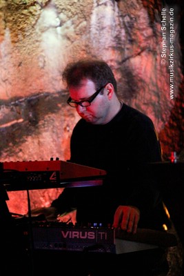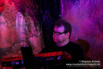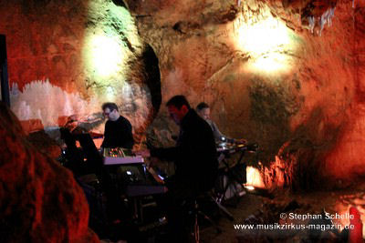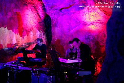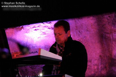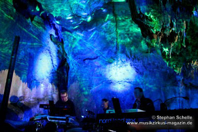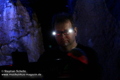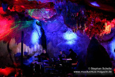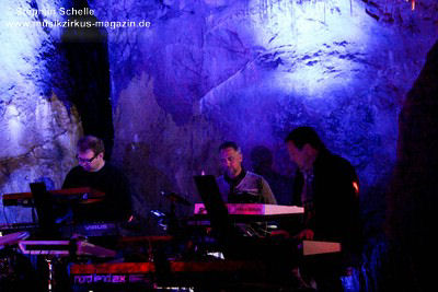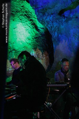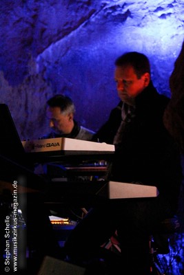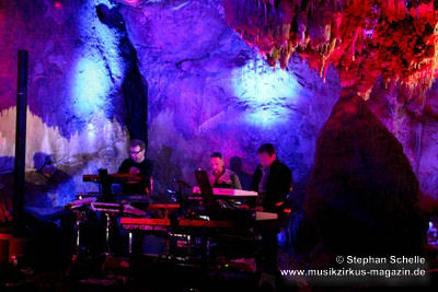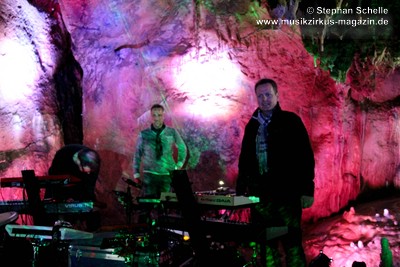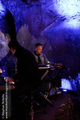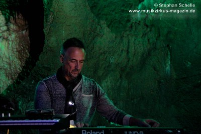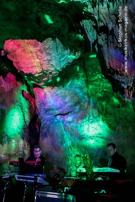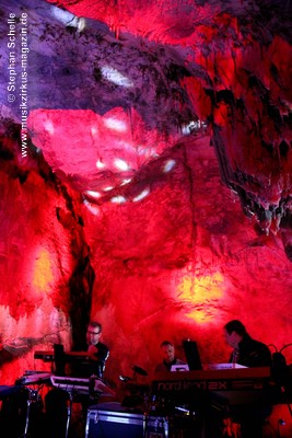 Dem folgte dann das 14minütige „Stratosphere“, das durch seine sphärischen Klänge ebenfalls gut in die Höhlenszenerie passte. Dieses Stück war aber wesentlich rhythmischer als der Opener. Und dann ging es mit dem zweiten neuen Track los, „Dechenhöhle Part 2“, bei dem die Synthies nur so zirpten. Hier nutzte Axel einen Sound aus seinem Roland Gaia, der mich sehr stark an Walgesänge erinnerte. Dazu waren an der Decke der Kanzelgrotte Lichteffekte zu sehen, die an eine sich bewegende Wasserfläche erinnerten und somit den Sound der Wale noch unterstützten.