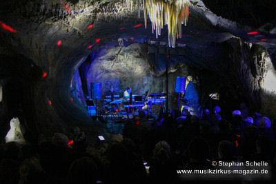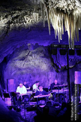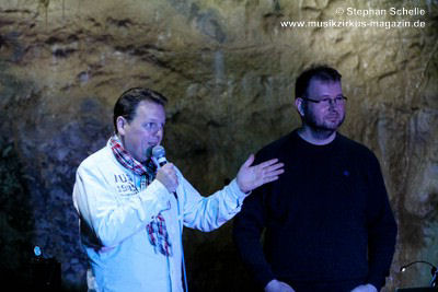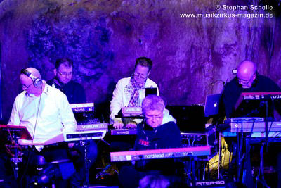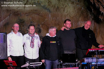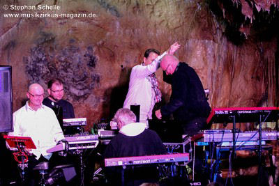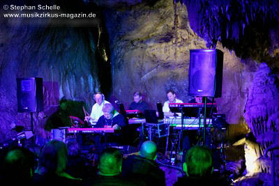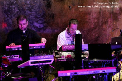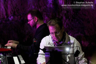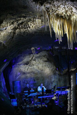 Die Klangfarben von Stück Drei waren eine Spur surreal. Es hörte sich jetzt so an, als wären wir unter Wasser angekommen und die Sonne spiegle sich auf der Wasseroberfläche, die man aus dem Untergrund betrachtet. Leicht verschrobene und düstere Sounds mischten sich dahinein. Axel und Andreas war aber alles andere als düster zu Mute, denn die hatten sichtlich Spaß an dem Auftritt und der Musik, denn ihr Gesichtsausdruck verriet große Spiellaune. Ein bisschen erinnerte mich dieser Track mit seinen mystischen Klangfarben an den Tangerine Dream-Soundtrack „Sorcerer“. Es dauerte gut sieben Minuten bis die beiden den Track in hellere Gefilde leiteten und teils sakral wirkende Klänge produzierten, was sehr gut in die Kanzelgrotte passte. Nach weiteren gut zwei Minuten kam dann ein Rhythmus auf und geleitete das Stück in den typischen Pyramid Peak-Kosmos. Dieser zweite Teil des Stückes war wesentlich rhythmischer und melodiöser und von einem stampfenden Beat unterlegt.