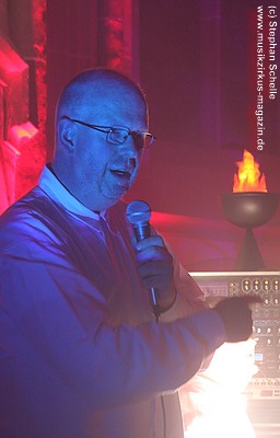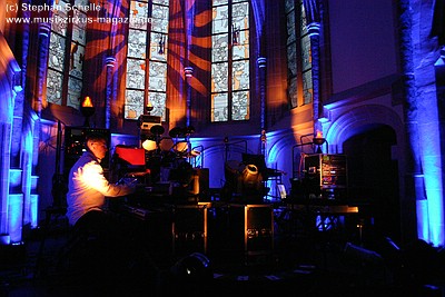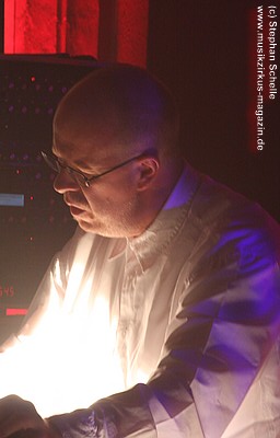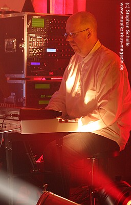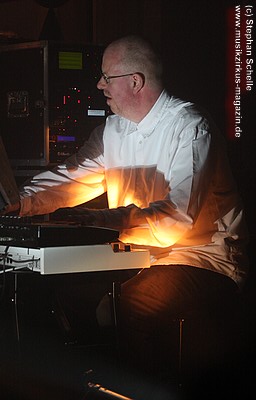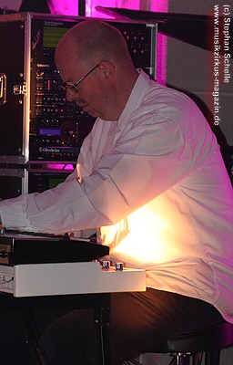 an seinen Tastaturen und spielte eine etwas sakral anmutende Melodie.