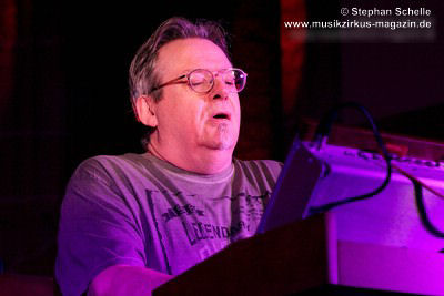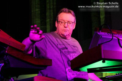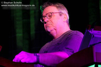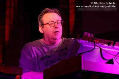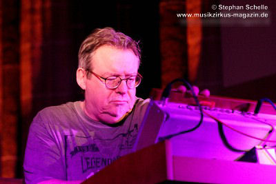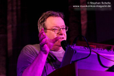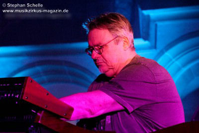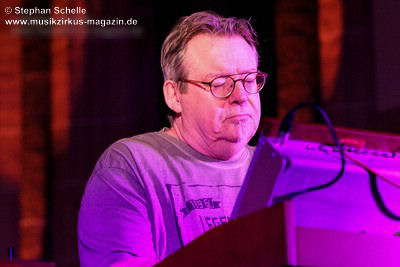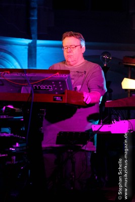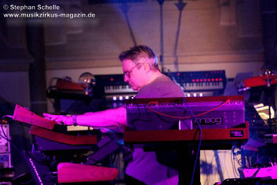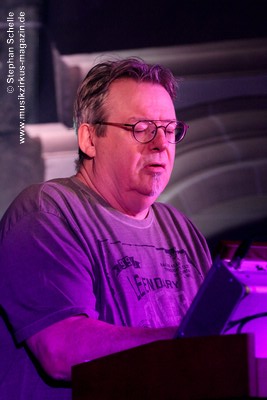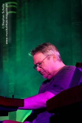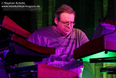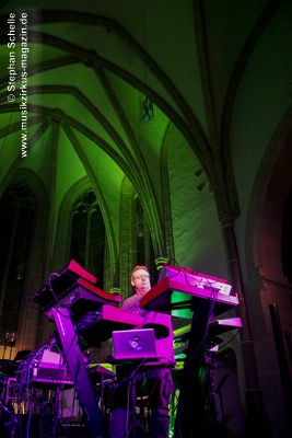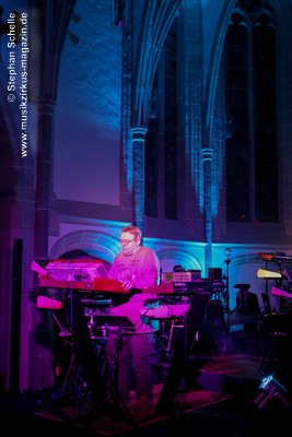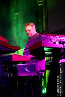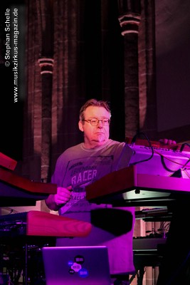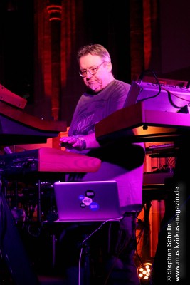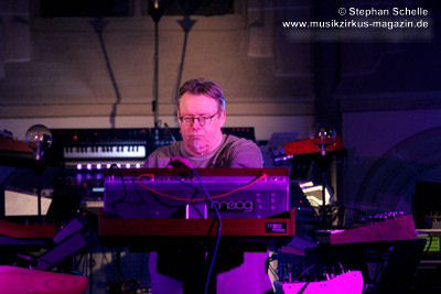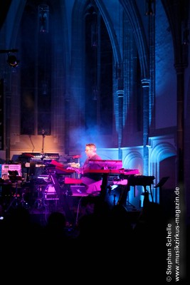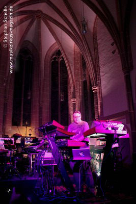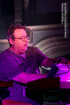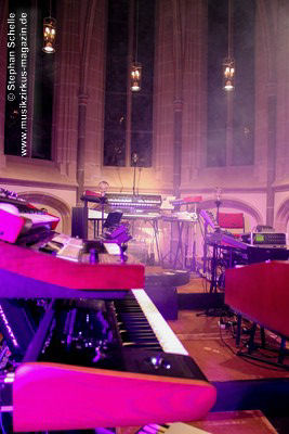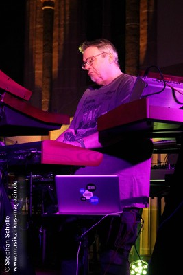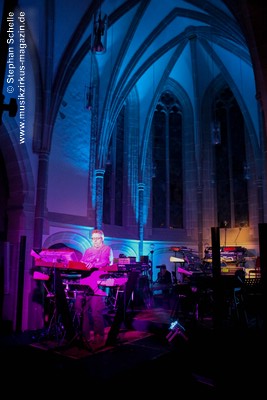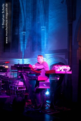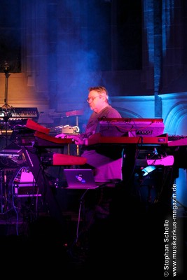 Neben einem Stück von seinem aktuellen Album „Once The Dust Settles“ griff er tief in sein Repertoire und holte einige tolle ältere Stücke wieder hervor. Bis ins Jahr 1994 reichte der Rückblick von Ron Boots. Den Beginn machte aber das Stück „The Hour Of The Wolf“ von seinem 2008’er Soloalbum „See Beyond Times, Look Beyond Words“ in einer ca. zehnminütigen Fassung. Fette Synthiesounds durchzogen von Beginn an die Halle der Kirche. Ron hatte schon zu diesem frühen Beginn einige Sounds übereinander gestapelt, so dass die Stücke seines Gigs sehr voluminös rüberkamen. Darauf platzierte er dann - wie im Opener - die Melodielinien. Die erste Hälfte des Stückes zeigte sich noch sehr getragen und ruhig, wechselte dann aber in einen druckvollen Part, als der Sequenzer seine Arbeit aufnahm. Das war schon mal ein gelungener Einstieg in die musikalische Welt von Ron Boots.