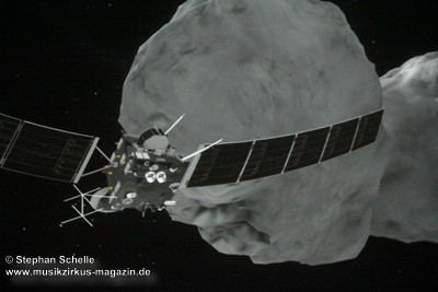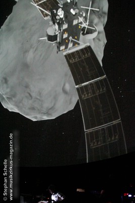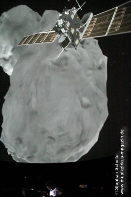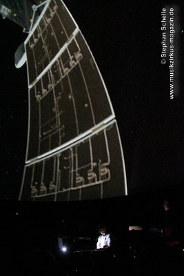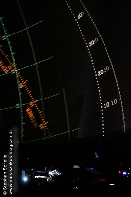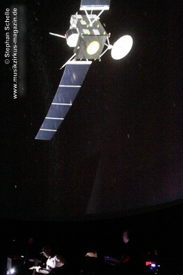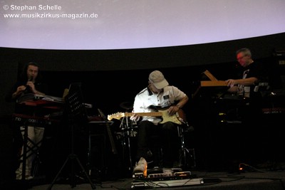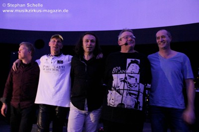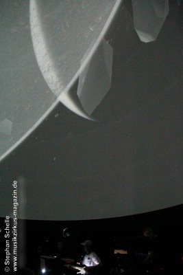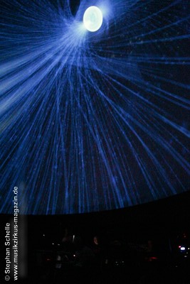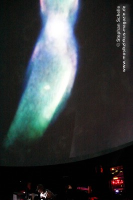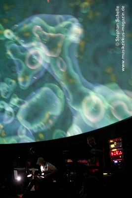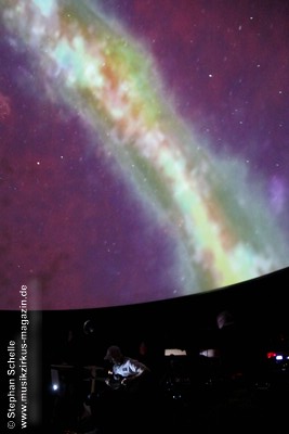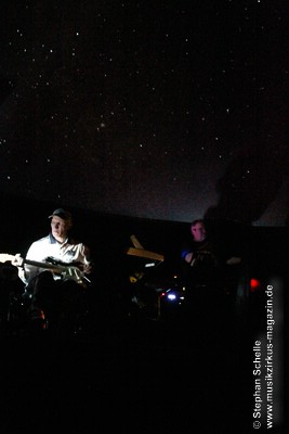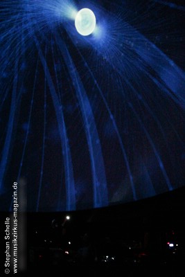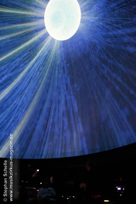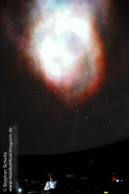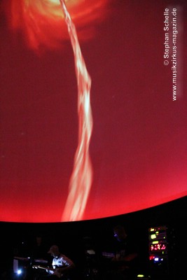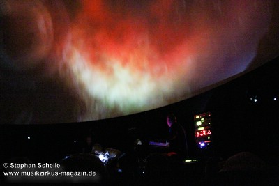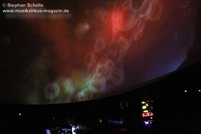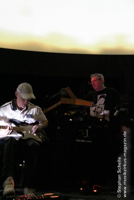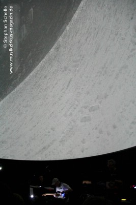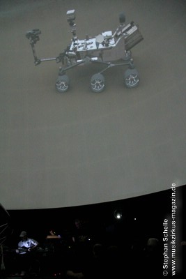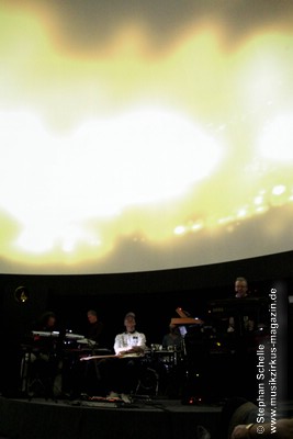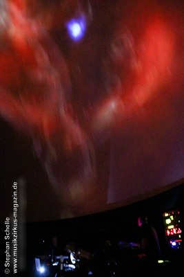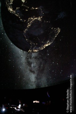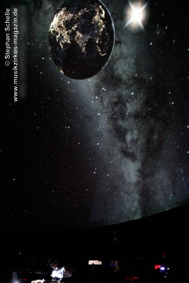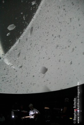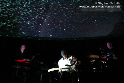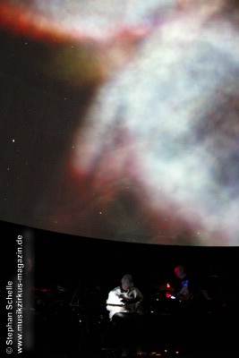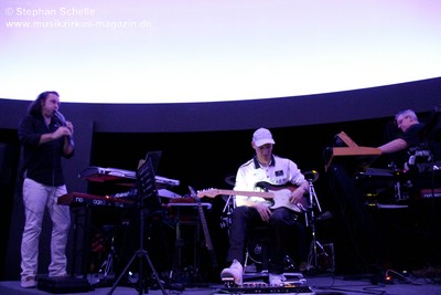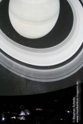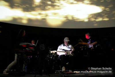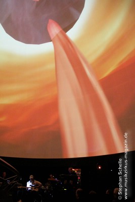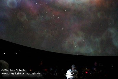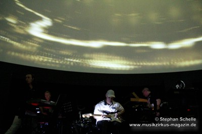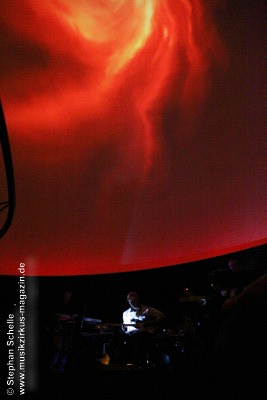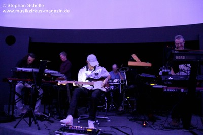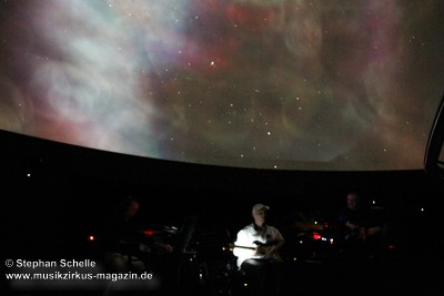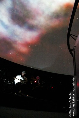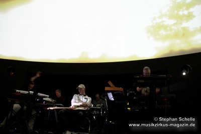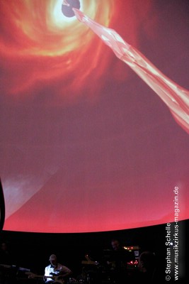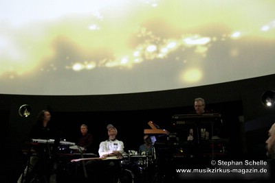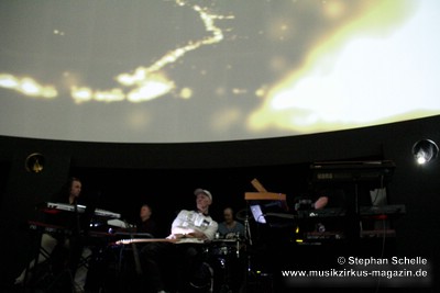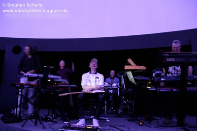Nach der Pause ging es dann kraftvoll weiter. Ron fragte die Zuschauer zunächst, ob die Musik des ersten Parts zu laut gewesen sei. Na klar, für ein Planetarium, bei dem man eher schwebende Klänge erwartet, war das schon recht rhythmisch und auch rockig angelegt. Ron erklärte, dass sie schließlich zum Jahresende mit ihrer Musik noch einmal den Staub aus der Kuppel fegen wollten, was ihnen sicherlich auch gelungen ist. Neben den schon auf der Bühne befindlichen Musikern kam für einige Stücke auch noch der niederländische Keyboarder René Splinter als weiterer Musiker auf die mittlerweile recht eng gewordene Bühne.