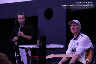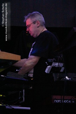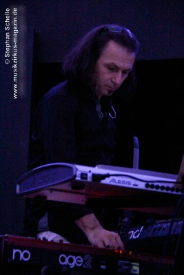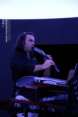 Nach diesem rockigen Beginn ging es dann weiter mit dem neuen Stück „Closed Eyes“, einer wunderbaren Pianoballade, die eine Spur nach Tangerine Dream klang, was vor allem an den verwendeten Sounds lag. Nach einem etwas düster angelegten Übergang, ging es dann wieder rockiger und in einer sehr treibenden Art im nahtlos folgenden „Storms Over IO“ zur Sache und auch Eric van der Heijden stieg nun mit ins Geschehen ein. Dieser Part klang ebenfalls wieder wie eine rockige Nummer von MorPheuSz, die ja jetzt komplett auf der Bühne standen. Eric zauberte aus seinem Windcontroller wieder die tollsten Klänge. So spielte er beispielsweise eine Passage, die sich zum verwechseln nach einer Trompete anhörte. Damit kamen noch einmal ganz neue Soundstrukturen in Ron’s Musik.