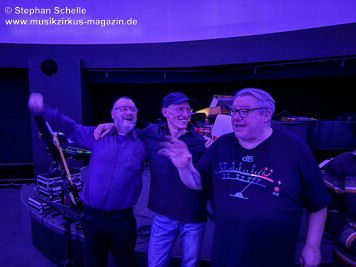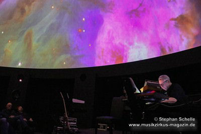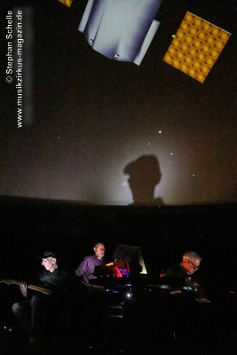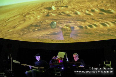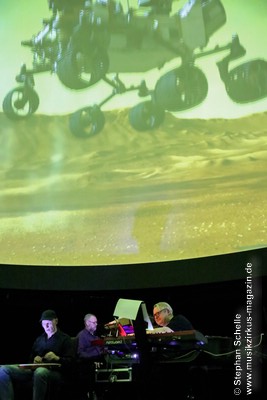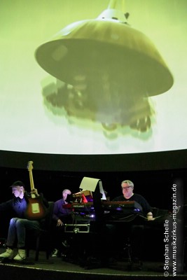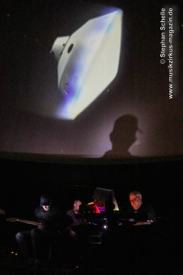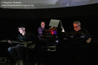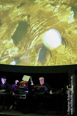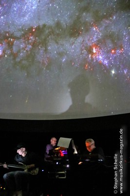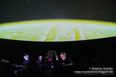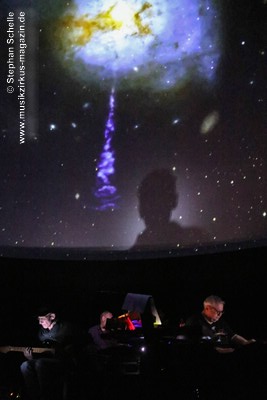 Als krönenden Abschluss durfte dann Frank Dorittke noch einmal – von Ron und Stephan an den Synthesizern unterstützt – seine Saitenkünste unter Beweis stellen und eine Varation von Pink Floyd’s „Comfortably Numb“ zum Besten geben. So endete ein wunderbares Konzert weit nach Mitternacht und begrüßte das neue Jahr, das eige Stunden danach folgen sollte, mit sehr atmosphärischen Klängen. Eine – wie immer – sehr gelungene Veranstaltung, bei der auch die tollen, ansprechenden Bilder an der Kuppeldecke die Musik und die Atmosphäre perfekt unterstützten.