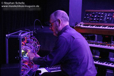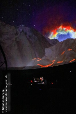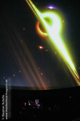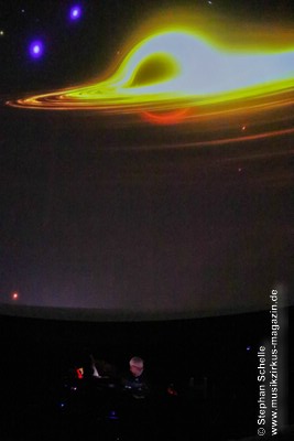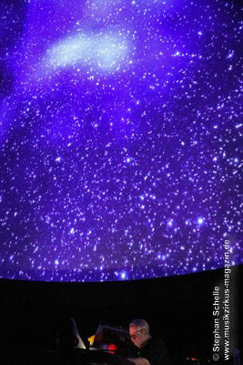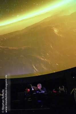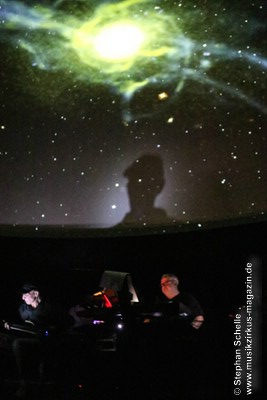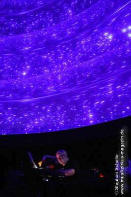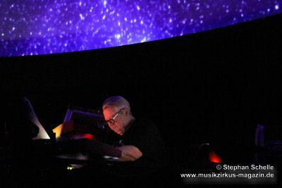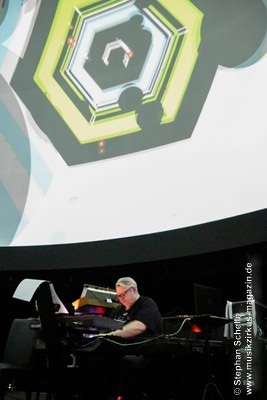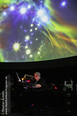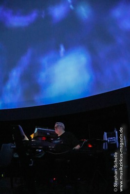 Nach einer Pause betrat dann Ron Boots die Bühne. Er spielte ein gut 50minütiges Soloset und verabschiedete sich damit als Live-Solomusiker vom Publikum. Die Stücke, die er spielte, gingen dabei nahtlos ineinander über, so dass eine Art Longtrack entstand. Es begann mit dem sphärischen „Opening“, einem komplett neuen Stück, das noch keinen Namen trägt. Synthesizerschwaden und –harmonien zogen durch den Kuppelsaal und wurden von herrlichen Bildern ferner Galaxien visualisiert. Ron baute im Verlauf einige Rhythmuselemente und Klänge ein, die auch an die „Berliner Schule“ erinnerten. Das sorgte für eine relaxte Atmosphäre unter den Anwesenden.