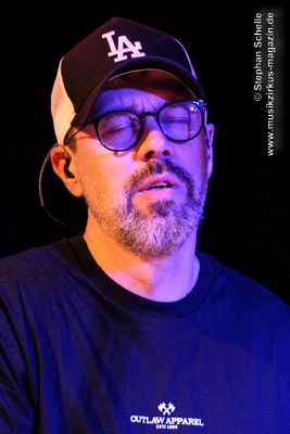 Danach wurde es im Stück „The Traveller“ elektronisch/loungig mit leichtem jazzigen Touch. „Comet Song“ war dann wieder ein gesungenes Stück, das jetzt ein leichtes, baladeskes Popfeeling aufwies und dies wieder mit 70erJahre-Flair vermischte. Mit „Am Strand“ kam dann ein Stück, das von dem Projekt Der tiefe Raum stammt. Es begann, dem Titel entsprechend, mit synthetischen Geräuschen, die eine Strandatmosphäre mit Wellenrauschen, Möwengeschrei und Nebelhörnern etc. darstellten und dann in einen Part mit einem leicht loungigen, aber groovigen Part wechselte. Vor allem der Schlagzeugrhythmus war betörend und mitreißend, auf den Frank dann seine Melodielinien legte. Dann setzte nach einiger Zeit Frank mit Gesang ein.