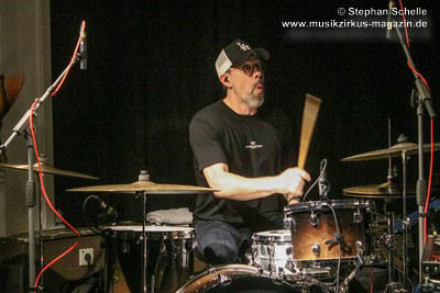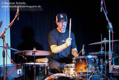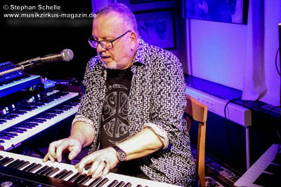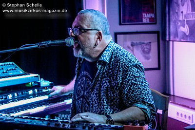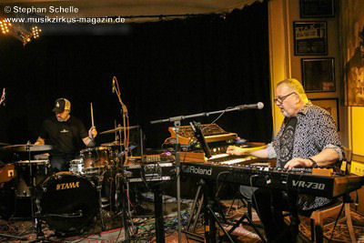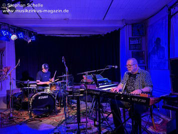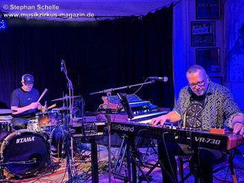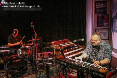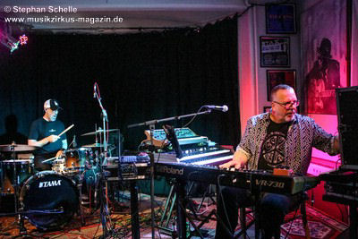 Das Konzert von S.o.P. startete mit der „S.o.P. Overture“, die dann nahtlos in das Stück „Cosmic 1“ überging. Hier boten die Beiden einen rockig/jazzigen Beginn, der schon mal zeigte, welch druckvolles Set die Besucher erwartete. Franks Orgelsounds harmonierten hier bestens mit Tommys druckvollem Schlagzeugspiel und bauten nach wenigen Momenten ein 70er-Jahre-Rockflair auf. Ein grandioser Beginn, der dann nach ca. viereinhalb Minuten in das Stück „Cosmic 1“ überging. Jetzt pulsierte zunächst ein druckvoller Synthesizersound, den Tommy am Schlagzeug mit schnellen rhythmischen Beckenschlägen konterte. Dann wurde es sehr rhythmisch. Ein treibender Schlagzeuggroove traf auf Gänsehaut treibende Synthesizerflächen. Da klang eine Mischung aus „Eindhovener Schule“ á la Ron Boots und „Berliner Schule“ á la Tangerine Dream durch, die mit rockigen Schlagzeugrhythmen garniert waren. Synthesizersounds, die an Walgesänge erinnerten wurden dann mit filigranen Schlagzeugklängen kombiniert. Diese synthetischen Walgesänge mündeten dann in einer hinreißenden Synth-Improvisation. Darauf folgte dann ein dynamischer Schlagzeugpart. Das führte schon zu diesem frühen Zeitpunkt zu Szenenapplaus. Was für ein unglaublicher Beginn. Und in diesem hohen Niveau agierten die Beiden dann auch das ganze Konzert über. Das führte dazu, dass einige Besucher/innen während des Konzertes tanzten.