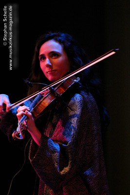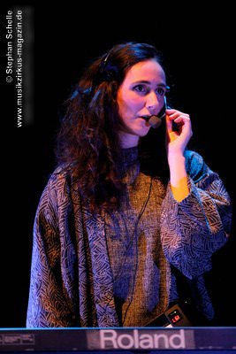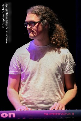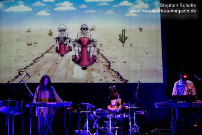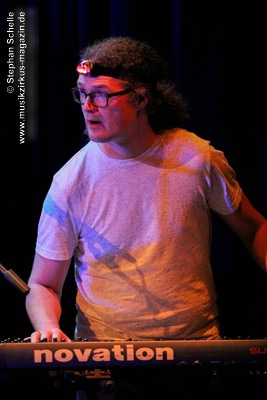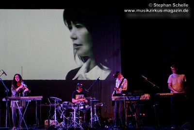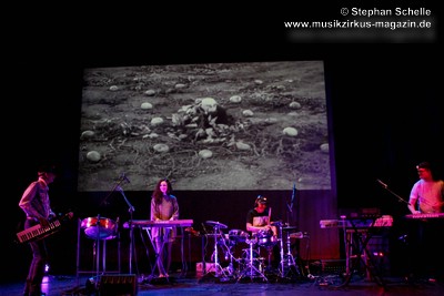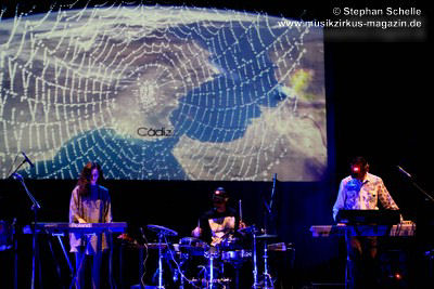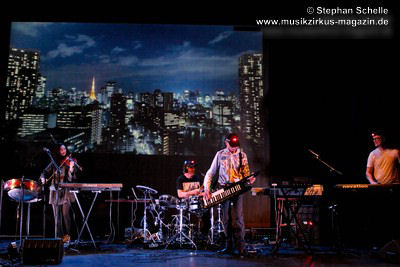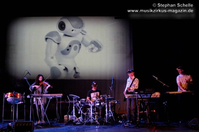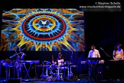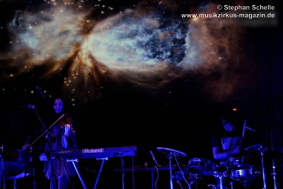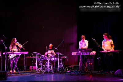 Space Art steht für einen leicht Pop angehauchten Elektroniksound, der eine gewisse französische Leichtigkeit mit sich bringt und durch aus auch mal jazzige Elemente in die Musik integriert. Gestartet wurde mit dem Stück „L'Obsession d'Archibald“, das mit pulsierenden Synthierhythmen begann. Die Melodie des Stückes und die sich wiederholenden Rhythmen stellten auch gleich die Blaupause für den Sound von Space Art dar, der eine ganz eigene Faszination ausmacht. In diesem Stück kamen sowohl elektronische Musik wie auch Artrockelemente zum Tragen. Die Vier agierten sehr gut zusammen und machten aus dem Stück eine Art Space-/Artrocknummer mit treibendem Groove. Die besondere Note bekam das Stück durch Lilli’s Violinenspiel. Sehr gut passte auch das druckvolle Schlagzeugspiel von Marc Hazon ins Gesamtbild. Auf der rückwärtigen Leinwand zogen derweilen Bilder aus dem All mit leichten Verfremdungen dahin.