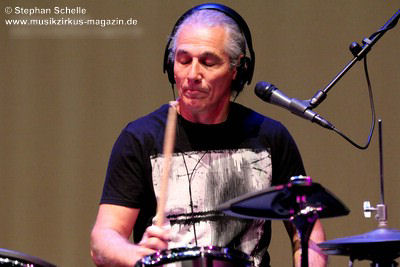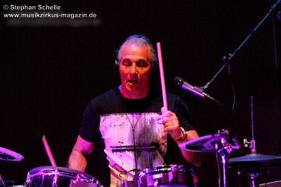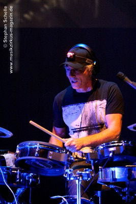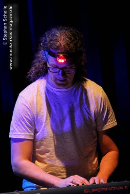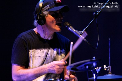 Das folgende „Optical Illusion“ startete mit einem treibenden Beat und herrlichen Synthiesounds, die als Intro in diesen Pop angehauchten Track führten. Bei diesem Stück kam dann erstmals Gesang auf. Ein sehr schönes Stück, das neben druckvollem Schlagzeug, zarten Violinenpassagen vor allem durch seine eingängige Melodie bestach, die einige klassische Motive enthielt. Das Stück „On The Web Again“ hatte einige Sounds und Klangfolgen die an Vangelis‘ Album „Albedo 0.39“ erinnerten. Das Stück war aber keine Hommage an den Griechen, sondern wechselte nach einigen Momenten in einen leicht jazzigen Teil, bei dem Dominique durch eine Sololinie glänzte. Im Mittelteil hatte dann Marc Hazon die Chance sich mit einem klasse Schlagzeugsolo zu präsentieren bis die Sequenzer wieder mit einstiegen und sich eine Art Konversation zwischen Schlagwerk und Synthie entwickelte. Das war druckvoll und rockig zugleich und Marc Hazon konnte sein Können eindrucksvoll unter Beweis stellen.