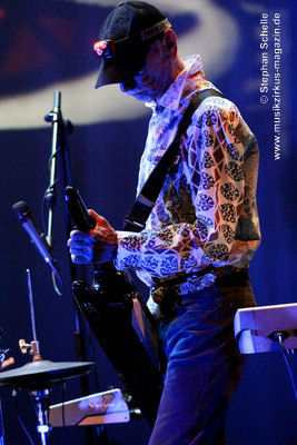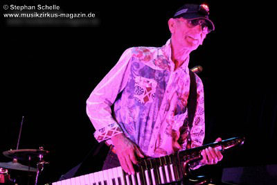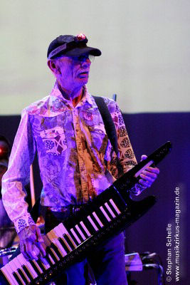 An das Drumsolo schloss sich dann nahtlos mit „Onyx“ der größte Hit von Space Art an, der die Band in den 70’er Jahren bekannt machte. Auch heute klingt dieses Stück noch frisch und eingängig. Hier zeigt sich auch die Nähe zu dem anderen großen Act der 70’er, nämlich zu Space, die mit „Magic Fly“ einen Riesenhit hatten. Dominique wechselte während des Stückes erstmals an sein tragbares Keyboard, um sich damit auf der Bühne frei zu bewegen. Sehr lustig waren die Zeichentrickanimationen, die während dieses Stückes auf der Leinwand gezeigt wurden. Auch das folgende „Speedway“, ebenfalls aus den 70’ern, schlug in dieselbe Kerbe, denn die eingängige Melodie hatte wieder einiges an Popappeal.