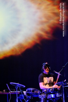 Für einige Showelemente sorgte neben den Filmen auf der Leinwand vor allem Schlagzeuger Marc Hazon (spielte auch schon in der Band Stone Age mit Dominique Perrier, Jerome Gueguen und Michel Valy zusammen), der wie ein Rockschlagzeuger agierte, sich aber sehr gut in die einzelnen Stücke einbrachte. Eines der Markenzeichen bei Space Art-Auftritten ist die Stirnlampe, die von den Musikern (alle außer Lilli) während der Konzerte getragen wird, so auch beim E-Day.