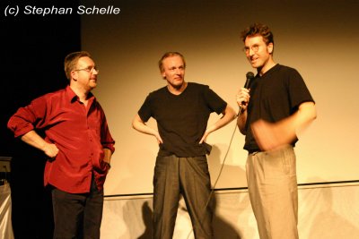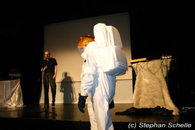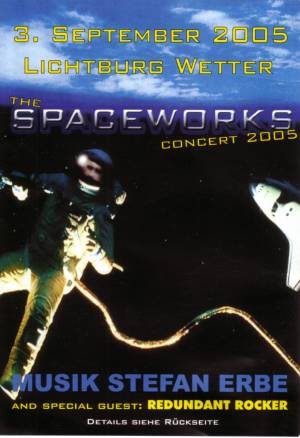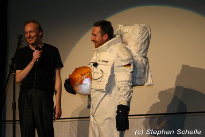 Stefan Erbe, Bernhard Wöstheinrich und Telemach Wiesinger Dann kam der Initiator und Lokalmatador, Stefan Erbe auf die Bühne. Entsprechend dem Titel der Veranstaltung hatte sich der „Lt. Erbe“ in ein Astronautenkostüm gezwängt. Ursprünglich wollte er das Konzert in diesem Outfit bestreiten, doch aufgrund der sommerlichen Temperaturen, die vor der Lichtburg nicht Halt machten, musste er darauf verzichten.