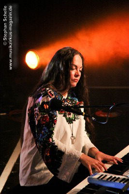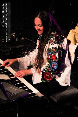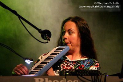 Nach diesem ersten Stück klappte Spyra seinen Rechner zu und spielte fortan nur noch auf analogen Synthesizern. Er hat wieder Spaß daran gefunden mit diesem alten Equipment zu arbeiten um aus dem organischen Prozess heraus Sequenzen zu entwickeln, während er die Instrumente spielt. Zeitweise erinnerten Passagen in den Stücken an den frühen Klaus Schulze. Schnell wurde deutlich, dass hier wahre Könner ihrer Instrumente am Werk waren. Das zweite Stück „Dusk“ enthielt ein von Roksana auf der Mundorgel gespieltes Intro, das recht ethnisch klang und aus ihrer Ukrainischen Heimat zu stammen schien.