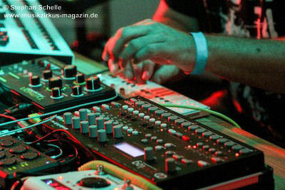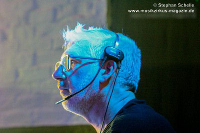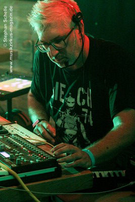 In Vorbereitung auf seinen Auftritt beim Electronic Circus hatte er dann seine Soundarchive durchforstet und stieß auf die Dateien für das China-Konzert. Die Programmierten Parts von „Niemand lacht rückwärts“ (Liveversionen sind auf den Alben „Sauce Hollandaise“ (1998) und „@shra“ (2002) erschienen) nutzte Steve um darauf zu improvisieren. Steve begann zunächst wieder recht spacig, das änderte sich aber nach gut einer Minute Dieser hypnotische Track mit seinen typischen Ashra-Sounds/Beats stellte dann auch den Höhepunkt seines Sets dar. Das sorgte dann für Begeisterung im Publikum, auch wenn Steve allein nicht den Druck und die Dynamik entfalten konnte, wie es die vierer Formation aus Göttsching, Grosskopf, Ulbrich und Baltes aufs Parket legten. Harald Grosskopf, der ebenfalls zur damaligen Ashra-Formation gehörte und bei diesem Konzert in der ersten Reihe saß, war ebenfalls sehr bewegt von diesem Track. Nach dem Konzert umarmten sich beide, die an diesem Abend 50% von Ashra ausmachten. Es war eine Reise in die Vergangenheit mit Sounds im Hier und Jetzt, denn Steve verstand es die Loops für sich zu vereinnahmen und daraus etwas grandioses Eigenes zu machen. Steves Soloauftritt war eine hypnotische Reise, die von Beginn an bis zum letzten Ton fesselte.