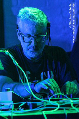 Steve startete mit zwei neuen Solo-Tracks mit den Titeln „Dark Gravity Part 1“ und „Dark Gravity Part 2“, die er bis dato so noch nicht gespielt hatte und die aus Improvisationen bestanden. Futuristisch mit leicht dröhnenden Klängen die sanft anschwollen, startete er in sein Set. Das hatte in der Tat etwas spaciges. Langsam entwickelte sich der Track und es kamen herrliche Harmonien hinzu. Das war wie für einen Soundtrack der Marke „2001 - Odyssee im Weltraum“ gemacht. Dort streute Steve dann noch Sprachsamples ein. Nach gut sieben Minuten kam dann ein Sequenzerrhythmus und nach weiteren drei Minuten ein Beat aus dem Drumcomputer hinzu. So entwickelte sich eine absolut hypnotische Stimmung. Ähnlich gestaltet sich auch der zweite Part, der allerdings noch mit mehr Harmonien aufwartete. Dabei nutzte Steve einen Controller, den er mit dem Mund bedienen konnte. Dabei handelt es sich, wie Steve mir erklärte, um einen Yamaha Breath Controller, der einen alten analogen Synthesizer (auch von Yamaha) steuert (Yamaha CS01 - quasi die Baby-Version vom Vangelis Synth). Hier kann man über den Blasdruck Filter und Lautstärke steuern, was ein sehr ausdrucksstarkes Spiel ermöglicht.