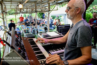 Als Zugabe spielte Thomas dann noch eine Coverversion von „Oxygene Part 6“ des großen Franzosen Jean Michel Jarre. Diesem Stück, dass in fetten Klängen durch den Garten zog, klang wie vom Meister selbst. Somit hatte er sowohl Reminiszenzen an die großen Musiker der Elektronik aus Berlin, Düsseldorf und Frankreich in seinem Programm.