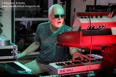 Im letzten Stück des offiziellen Sets kamen dann Klänge auf die an die großen Düsseldorfer Klangpioniere Kraftwerk erinnerten. Sehr rhythmisch schossen nun die Sounds aus den Boxen. Die Klangkollagen waren dabei etwas experimentell angelegt und wirkten bewusst etwas schräg. Ein Moog-Solo mit sägendem Sound zerschnitt dann den Rhythmus in ähnlich schräger Form. Das Stück hatte etwas chaotisches, das aber bei näherem Hinhören eine Struktur besaß. Das macht es umso schwieriger zu spielen. Hut ab, vor solch einer Einlage, die nochmal die ganze Klasse von Thomas Jung offenbarte.