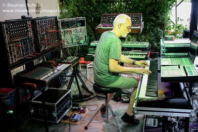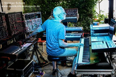 Thomas Jung hatte eine ganze Reihe an digitalem wie analogem Equipment mit in den Garten gebracht. Allein sein Instrumentarium sorgte schon mal für Aufsehen. Thomas spielte ein Set aus sieben Stücken, die er nahtlos aneinandergereiht hatte. Die Stücke waren so gut zusammengefügt und durch Bridges verbunden, dass sie einen homogenen Longtrack ergaben.