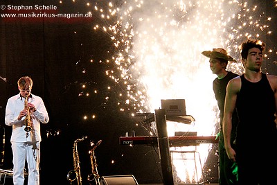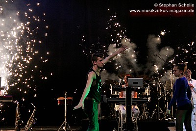 seinem Ende durch Funkenregen, die hinter den Plätzen der Musiker in die