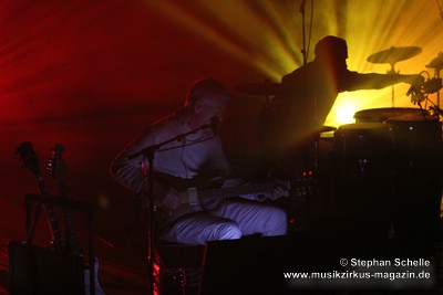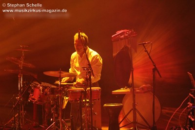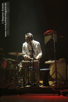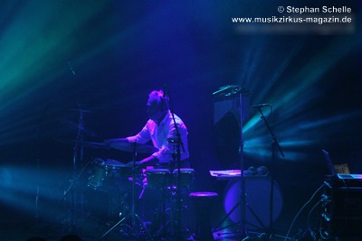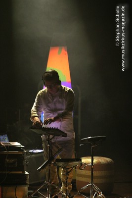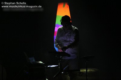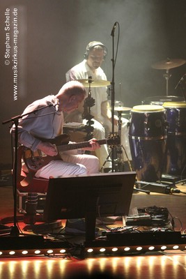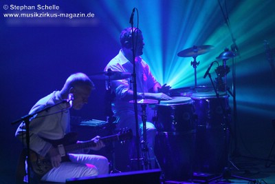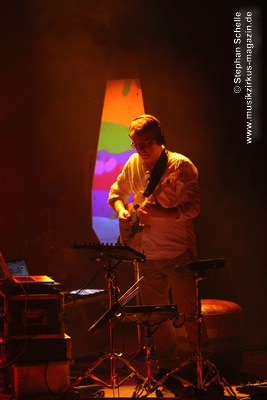 Dann legten Achim und Band los und starteten in ein Set das von treibenden Beats, elektronischen Klängen, organischen Perkussion, hypnotischen und rockigen Gitarrenlicks durchzogen war. Dabei klang die Musik streckenweise auch wie der Sound, den Manuel Göttsching mit Ashra bzw. Ash Ra Tempel live spielt. Die Stücke hatten einen unglaublichen Groove was vor allem durch die aus dem Rechner kommenden, teils pumpenden Beats hervorgerufen wurde. Der Einsatz von zwei Perkussionisten verlieh dem Ganzen darüber hinaus eine organische Note.