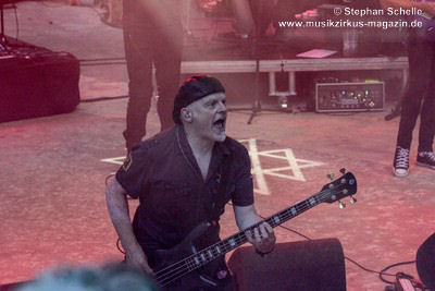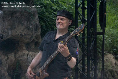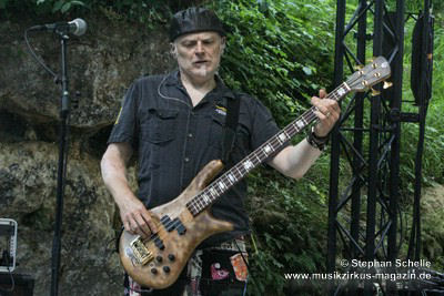 während er weiter seinen druckvollen Basspart spielte.