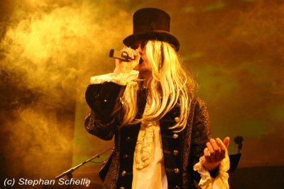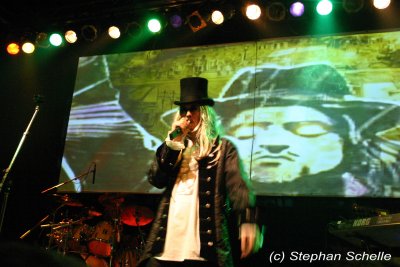 Eine kurze, humorvolle Einspielung auf der großen Bühnenleinwand läutete den Auftritt von Arena ein. Mit dem druckvollen Opener ihrer aktuellen CD „Pepper’s Ghost“, dem Stück „Bedlam Fayre“ starteten sie ihren Gig in Essen. Dazu waren schon einige der Comicbilder, die wir aus dem Booklet der CD kennen, zu sehen. In schwarzer Robe, Rüschenhemd, schwarzem Zylinder und blonder Perücke betrat Sänger Rob Sowden die Bühne und behielt dieses ungewöhnliche Outfit über weite Strecken des Konzertes an.