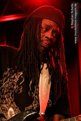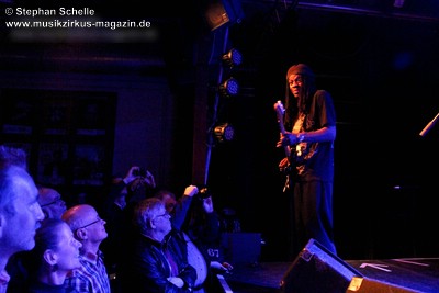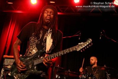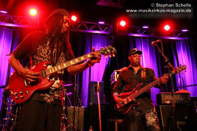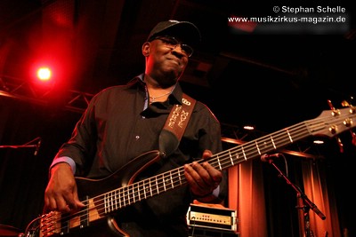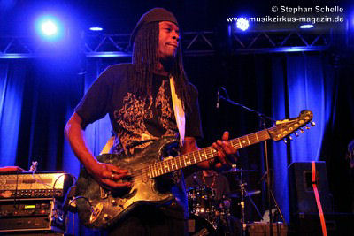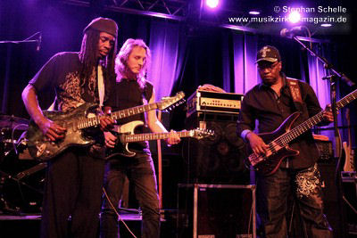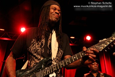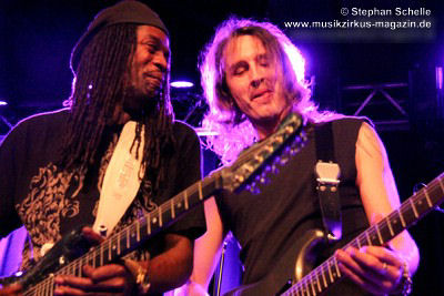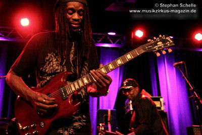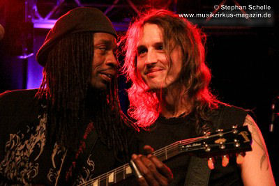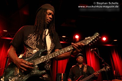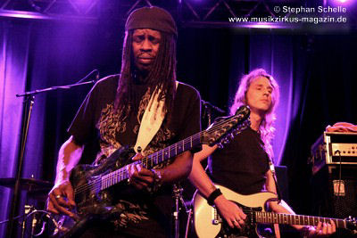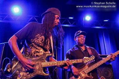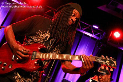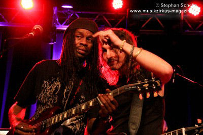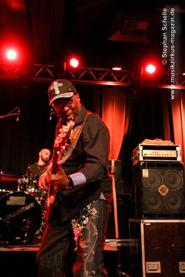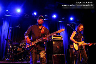 Los ging es aber erst einmal mit dem Instrumental „I’m Back“, bei dem die Richtung des Konzertes schon einmal vorgegeben wurde. Knackiger Bluesrock, bei dem sich schon zeigte, dass auf der Rhythmusmaschinerie von George Moye und Yoann die beiden Gitarristen Michael Goldschmidt (er spielte neben zahlreichen Rhythmusgitarrenparts auch einige eindrucksvolle Soli) und Bernard Allison (er stellte schon in diesem ersten Stück seine Fingerfertigkeit unter Beweis) in perfekter Abstimmung ganze Arbeit leisteten. Im Laufe des Konzertes legte Bernard Allison dann aber noch so manche Schippe drauf.