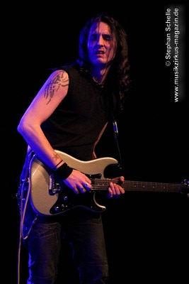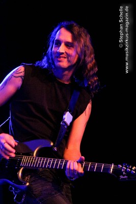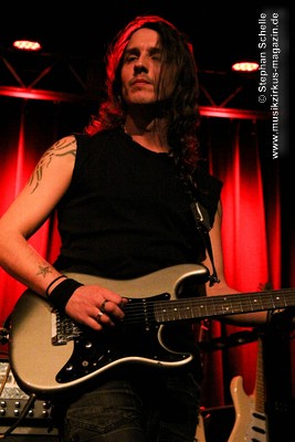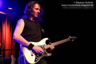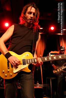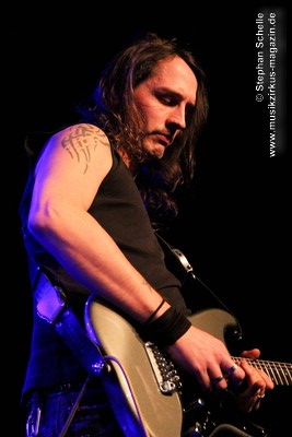 Danach war mit „Set Me Free“ wieder Zeit für eine lupenreine Bluesnummer. Schwerer Blues mit rockigen Elementen verzauberte die Besucher. Bernard übertraf sich in diesem Stück noch einmal selbst, denn er würzte diesen Song mit langen, fesselnden Soli und akzentuiert gespielten Passagen, während sich seine Mitstreiter dezent im Hintergrund hielten. In diesen Passagen spielte er förmlich mit dem Publikum und ging in einen Dialog mit der Menge vor der Bühne. Spätestens hier zeigte sich die ganze Klasse dieses Ausnahmegitarristen.