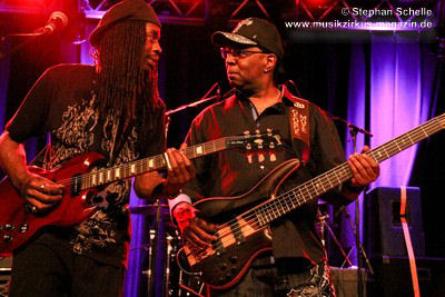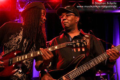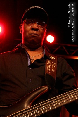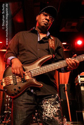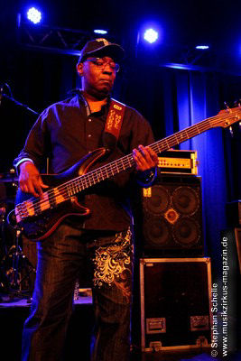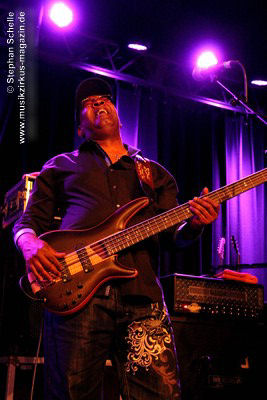 Danach versuchte Bernard im folgenden Instrumentalstück im wahrsten Sinne des Wortes einen Geschwindigkeitsrekord auf seiner E-Gitarre aufzustellen, denn er zog das Tempo im Verlauf der Melodie immer weiter an und steigerte sich in einen wahren Geschwindigkeitsrausch. Es war mehr als beeindruckend ihm dabei zuzusehen, mit welcher Leichtigkeit er über die Saiten seiner Gitarre fegte. Ein wahrer Profi an seinem Instrument. Dem schloss sich dann ein sehr druckvolles Solo von Yoann am Schlagzeug an, bei dem er seine ganze Klasse beweisen konnte. Da wurden nicht einfach technische Raffinessen aneinandergereiht, sondern das Solo war sehr melodisch angelegt und dramaturgisch gut aufgebaut. Dem folgte dann auch noch George Moye mit einem herrlichen Basssolo, bei dem er zeigte, warum man ihn auch Dr. Funk nennt. So baute er dann auch einige Passagen von Klassikern wie zum Beispiel Queen’s „Another One Bites The Dust“ in sein Solo ein.