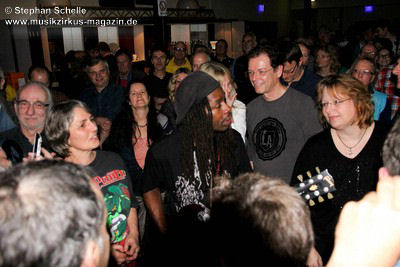 Den krönenden Abschluss des Hauptprogramms bildete dann eine ausufernde Version von „Give Me Back My Wig“, das er mit einem langen, bluesigen Instrumentalintro - hier baute er eine Passage von „Amazing Grace“ ein – begann. Er spielt bei diesem Stück seine Gitarre in der Bottleneck-Technik, was dem Sound noch einmal mehr Tiefe verlieh. Während des Stückes verließ Bernard die Bühne und wanderte minutenlang durchs Publikum, während er dabei weiterspielte. Auch einige Fotos mit Fans in der Menge (er posierte ganz gelassen mit den Fans) hielten ihn nicht davon ab, seinen Part traumwandlerisch weiterzuspielen.