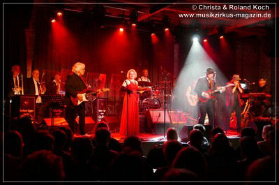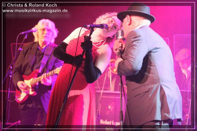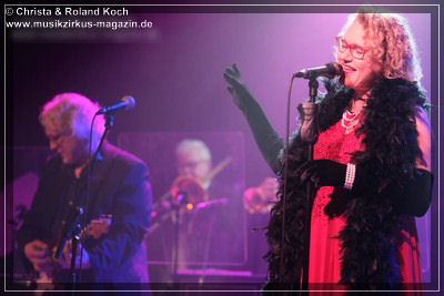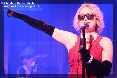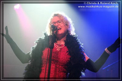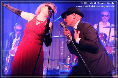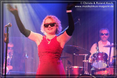 Auch beim Gesang wurden keinerlei Abstriche gemacht. Die beiden Hauptstimmen, weiblich Lydia Stone im signalroten Abendkleid (plus protzigen Perlenketten, schwarzer Federboa und edlen armlangen schwarzen Handschuhen) und männlich Norbert dazu stilecht im passenden Zweireiher und Al-Capone-Hut, werden ständig mehrstimmig aus dem Hintergrund kräftig und voluminös unterstützt. Es ist für ein abwechslungsreiches und vielfältiges Menü gesorgt und es ist ständig was los auf der proppenvollen Bühne.