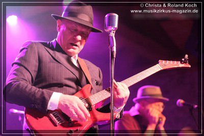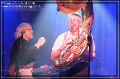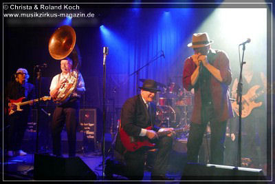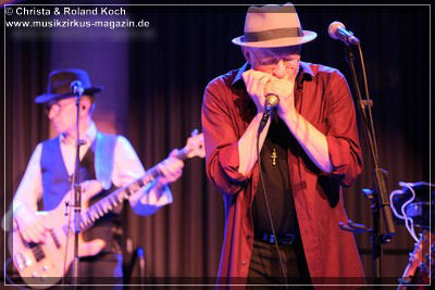 Die 2-stündige Blues-Reise hat Stopps in jedem Jahrzehnt der letzten einhundert Jahre, jede Epoche wird mit entsprechenden Kompositionen vorgestellt, gewürdigt, gefeiert, zelebriert. Norbert Egger hat sogar eine entfesselt aufspielende vierköpfige Bläser-Sektion; Kurt Gersdorf (Alt-Sax), Franz Neumeier (Bariton-Sax, musiziert auch bei Natural Blues und Berchtesgaden Blues Band), Harry Rehrl (Posaune), Markus Gorofsky (Trompete) sicher abgeschirmt hinter einem Plexi-Paravent; sowie mit dem Reichenhaller Hubert Grassl noch einen der wenigen deutschen Sousaphon-Spieler in das Magazin 3 gelockt. Mehr Authentizität geht fast nicht mehr. Doch, denn auch die britische Harmonika-Legende Steve Baker ließ es sich nicht nehmen, seinen alten Weggefährten aus der Hamburger Zeit Anfang der 80er, wieder einmal für mitreißende Duelle und Solis hier vor vollem Hause zu begleiten.