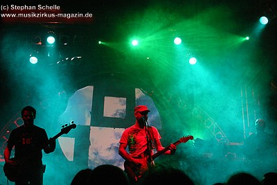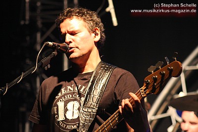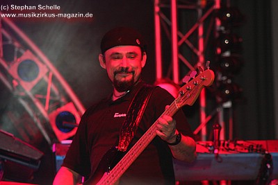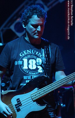 unterstützt, auf die Bühne, um von Martin Hofmann den Bass zu übernehmen,