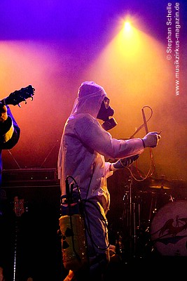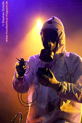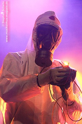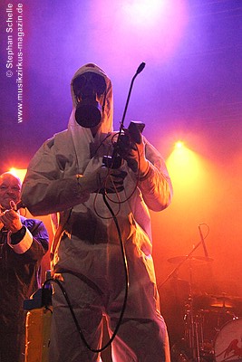 die Band dann einen in weiße Schutzkleidung verpackten Roadie als